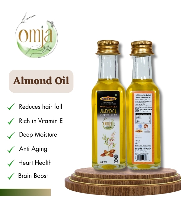 Experience the purity and benefits of Omja India’s Almond Wooden Cold Pressed Oil– a natural solution for health, beauty, and wellness.